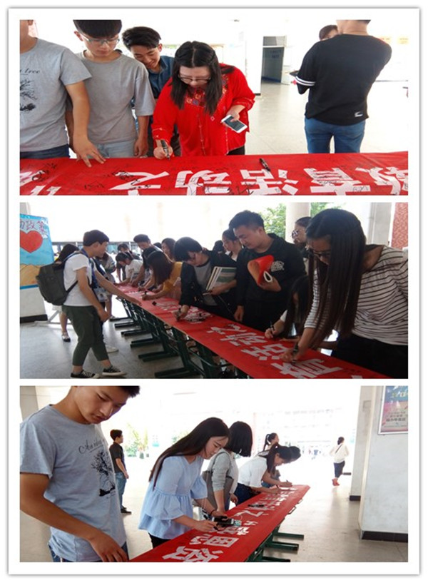 活动一开始,来自经贸系16级各班级的学生代表郑重地在红色的宣传标语上签下了自己的名字,以此来表示对活动的支持和响应。活动过程中,同学们积极主动的介绍本次活动的目的和意义,并为每班学生代表送上签名用的笔。