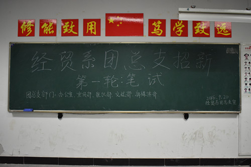 为给2016级新生提供一个锻炼自我、展示自我、提升自我的平台,同时也为团总支、学生会学生干部队伍充实优秀人才。2016年9月19、20日中午,经济贸易系团总支、学生会在1101、1102、1116和1119教室开展了招新笔试环节,共有500多名大一新生参加。