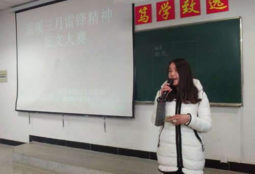 为贯彻雷锋精神,争做当代的雷锋和时代楷模,构建和谐文明的校园环境,形成良好的校园风气。2016年3月11日,经济贸易系团总支、学生会积极开展“温暖三月,雷锋精神”征文比赛。