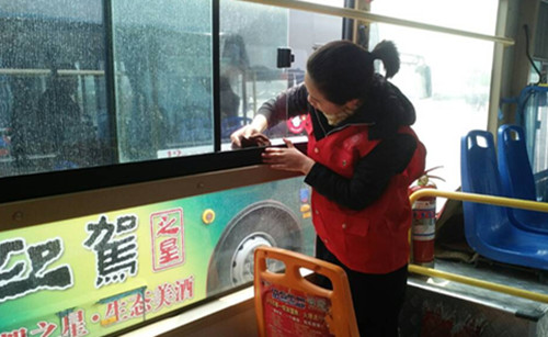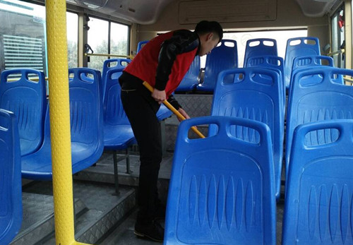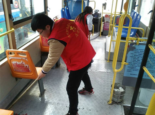 活动过程中,同学们穿着志愿者服装,用抹布把公交车擦干净,然后扫地、拖地,认真的打扫公交车的每个角落,希望每位乘坐公交车的人都觉得舒适。