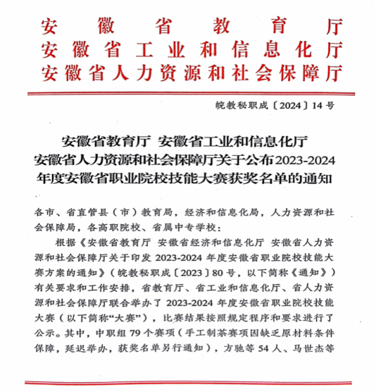 近日,安徽省教育厅公布了2023-2024年度安徽省职业院校技能大赛获奖名单,管理学院财务会计系在校实训中心的统筹安排下,学院的大力支持下,参赛师生的奋力拼搏下,荣获一等奖2项,实现建院以来,省赛一等奖0的突破。8名学生获得专升本免试入学资格。