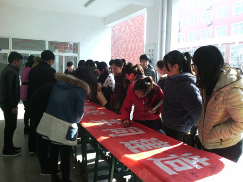 活动过程中广大同学都积极参与,在横幅上签上自己的名字。同学们在大大的横幅上签满了名字,保证在考试中必定做到自觉遵守考风,考纪,承诺以诚信对待每一场考试,考出真实水平。