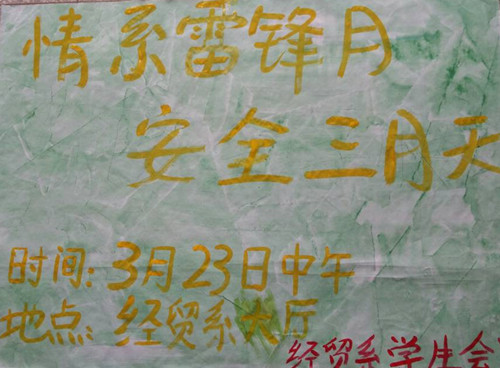 为了大力弘扬雷锋精神,2015年3月23日,在经济贸易系党总支书记的部署下,经济贸易系团总支、学生会组织志愿者们开展了文明安全,从我做起主题活动。