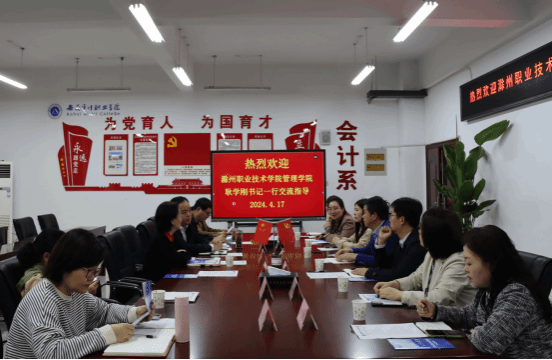 为进一步推进“双高校”建设,提升我院各专业教育教学水平,更新理念,开阔视野。 4月17日,管理学院党总支书记耿学刚、副院长颜洲、企业管理系主任张娴、会计专业负责人夏敏、财务管理专业负责人孙疏、旅游管理专业负责人李贝贝及教学秘书徐姗走进安徽审计职业学院会计系开展学习交流。审计学院会计系党总支书记张妍、系主任李强、系党总支副书记贾贤强等人热情接待我院一行。