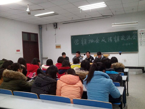 2014年12月7日晚,经济贸易系营销协会为了加强同学们对非法传销的认识,在致真楼1101教室开展了“反传销交流会”活动。
