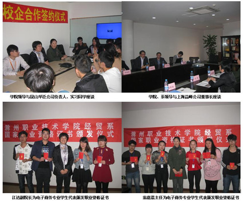 江院长代表学院对2012级电子商务专业和旅游管理专业实习生表示亲切慰问,并向电子商务专业的学生代表颁发了在校期间取得的助理电子商务师、助理营销师职业资格证书。