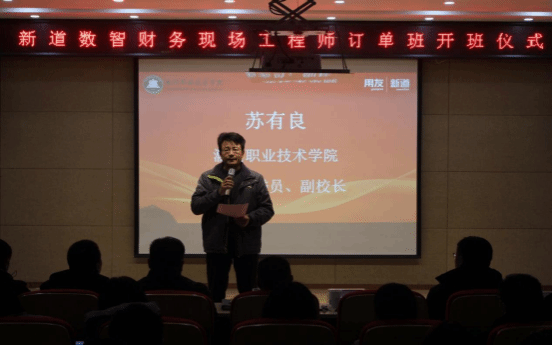12月18日,Beat365管理学院联合财经数智化领域龙头企业用友·新道科技股份有限公司,举行管理学院数智财务现场工程师订单班开班仪式。校党委委员、副校长苏有良出席并致辞,教务处处长唐义武、招生就业处副处长王义利,管理学院党总支书记耿学刚、副院长颜洲、党总支副书记何文婧,新道科技股份有限公司安徽省区总经理王小明、安徽省区教学服务总监黄锐、高级教育规划顾问董力贤等6位企业代表及订单班全体师生参会。