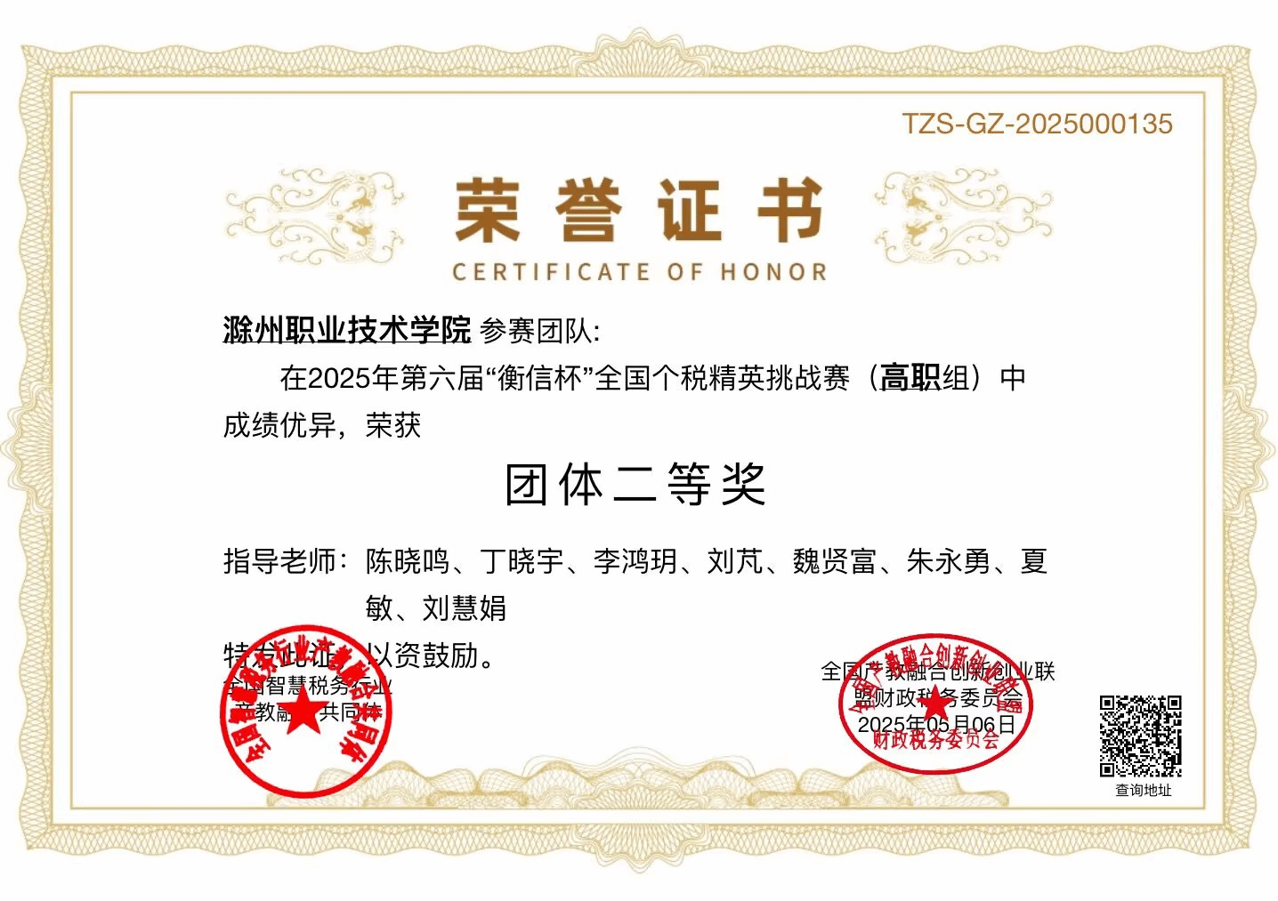 2025年第六届“衡信杯”全国税务精英挑战赛(高职组)于4月16日至29日在线上平台组织开展。本次比赛采用云端形式开展,来自全国150多所高职院校的15000名学生参与角逐。我院由夏敏、朱永勇、陈晓鸣、魏贤富、刘慧娟、刘芃、李鸿玥、丁晓宇等8位老师组成教师团队,组织用友·新道订单班和平行班共90名学生积极参赛,经过连续14天的知识和技能比拼,最终荣获团体二等奖的好成绩,8位指导老师分别获得“全国优秀指导教师”称号。