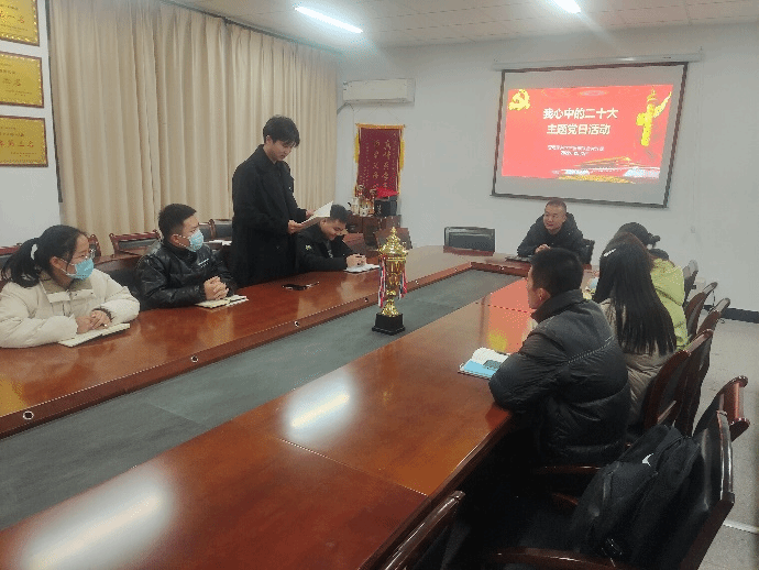 活动第一项,由支部组织委员李腾飞同志带领大家学习二十大报告,李腾飞同志以“一个中心任务”、“两步走”、“三个务必”、“四个自信”、 “五个必由之路”、 “六个坚持”、 “七个安全”、“中央八项规定精神”、“中国式现代化的九方面本质要求”为线索对二十大报告展开解读。通过报告中一组组亮眼的数字,直观全面的向大家展现了新时代取得的非凡成就。