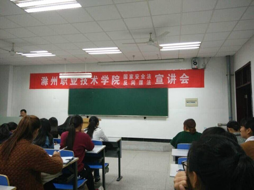 为了进一步加强学生的法制教育,加强和规范反间谍工作,依法履行维护国家安全的法律责任和义务,滁州职院技术学院于2015年10月28日在致真楼1119教室隆重举行《国家安全法》、《反间谍法》宣讲会。莅临此此讲座的是滁州市国家安全局的张科长和其同事。