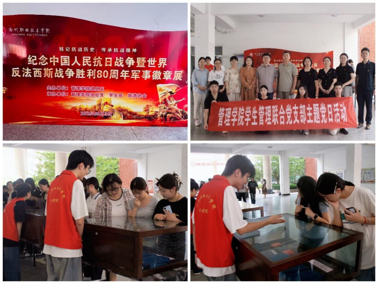9月3日下午,为纪念中国人民抗日战争暨世界反法西斯战争胜利80周年,引导师生深刻感悟抗战精神,激发爱国情怀与使命担当。管理学院举办纪念中国人民抗日战争暨世界反法西斯战争胜利80周年军事徽章展,管理学院学生管理联合党支部组织党员参观并举办主题为“铭记历史守初心 同心共筑强国梦”的主题党日活动。