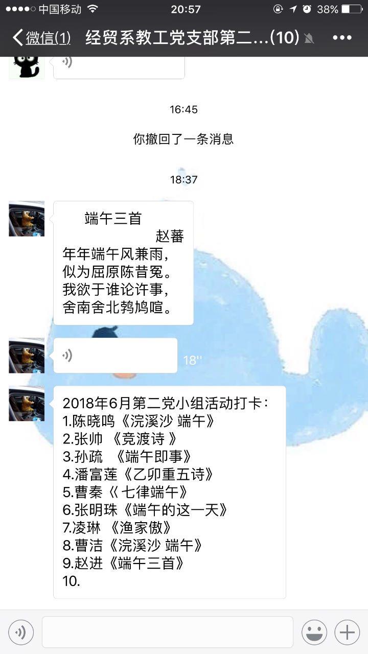 端午节,为每年农历五月初五,据《荆楚岁时记》记载,因仲夏登高,顺阳在上,故五月初五亦称为“端阳节”。此外,端午节还称为“午日节、五月节、龙舟节、浴兰节、诗人节”等。值此佳节之际,经贸系教工党支部第二党小组在微信群里开展了以端午为主题的诗歌朗诵活动,党员教师们的参与积极性很高,采取文字与语音打卡相结合的方式,弘扬传统文化。参与作品有既有古典诗词,也有现代诗歌,以新颖的形式普及节日知识,感受中华民族传统节日中折射出的浓郁的文化气息,进一步增强了爱国情怀,深化了爱国主义教育活动。