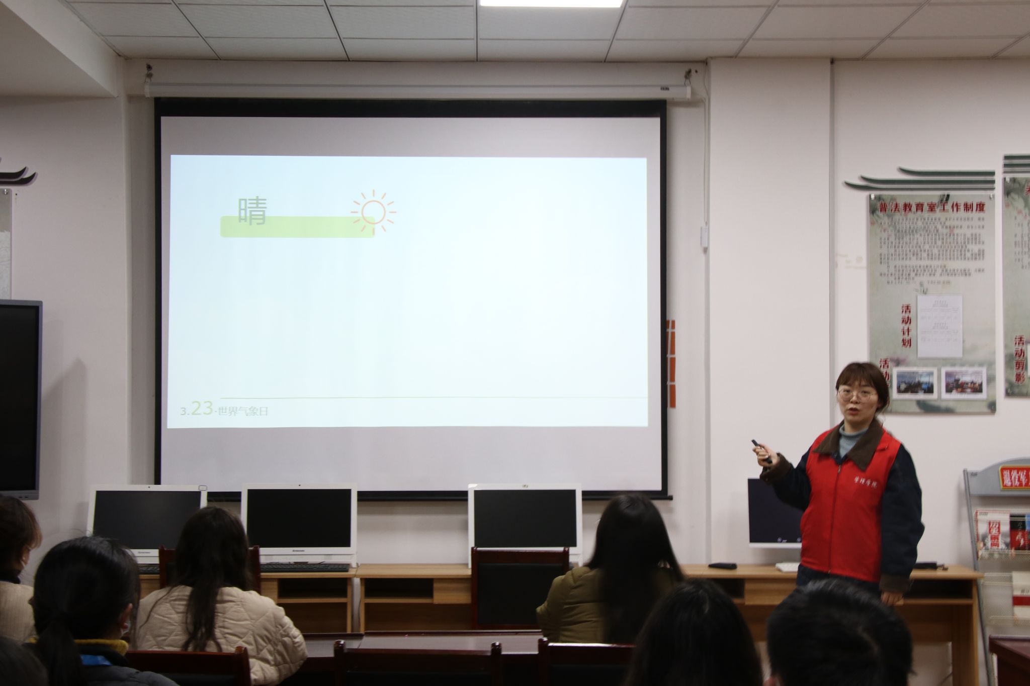 首先袁一老师通过PPT向大家介绍2023年世界气象日主题——“天气气候水,代代向未来”,接着又带领大家认识天气符号、学习记录天气,最后播放宣传片,让我们了解世界气象日的意义。