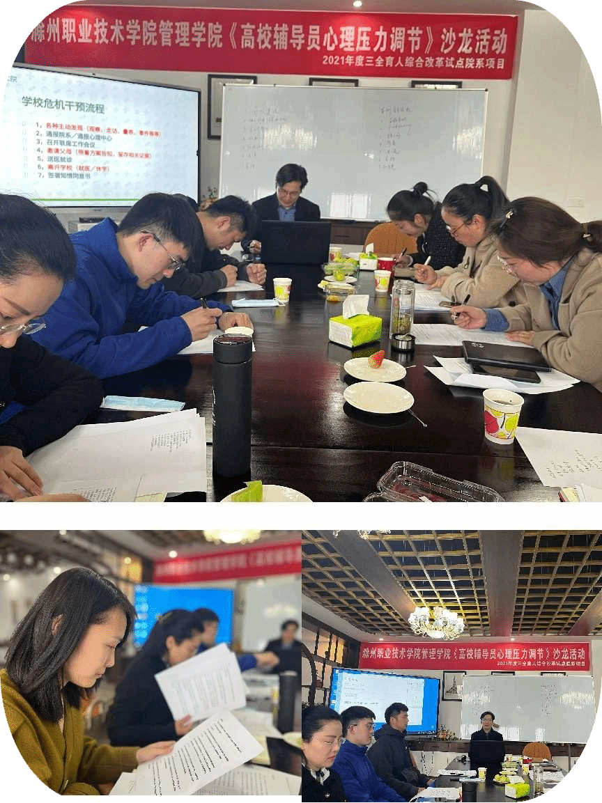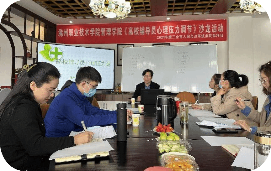为落实校2021年度“三全育人”综合改革院系试点项目之心理育人工程,调节高校辅导员的心理压力,由管理学院“蝴蝶的梦想”心理健康成长基地承办的高校辅导员心理压力调节沙龙活动于3月29日在致真楼六楼如期开展。参加沙龙活动的人员包括管理学院党总支副书记何文婧、管理学院专职辅导员和交通运输学院4名辅导员代表。