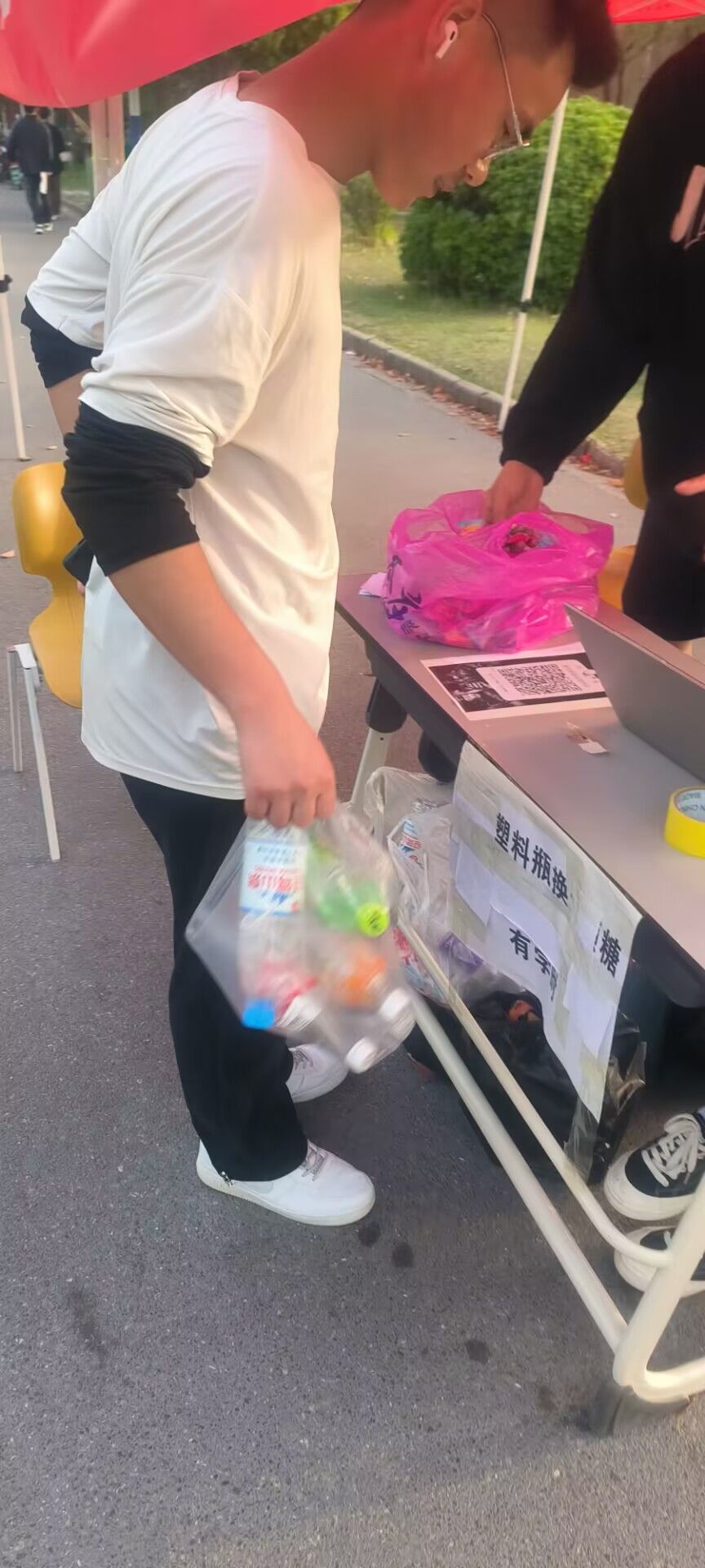 活动开始,志愿者积极向往来的同学大力宣传本次活动,向同学们说明举办此次活动的目的。通过类似以物换物的活动方式,让大家将身边的可回收垃圾回收换物,让垃圾获得新的价值,同时也能让同学们更好的学会垃圾分类,让校园更干净整洁。