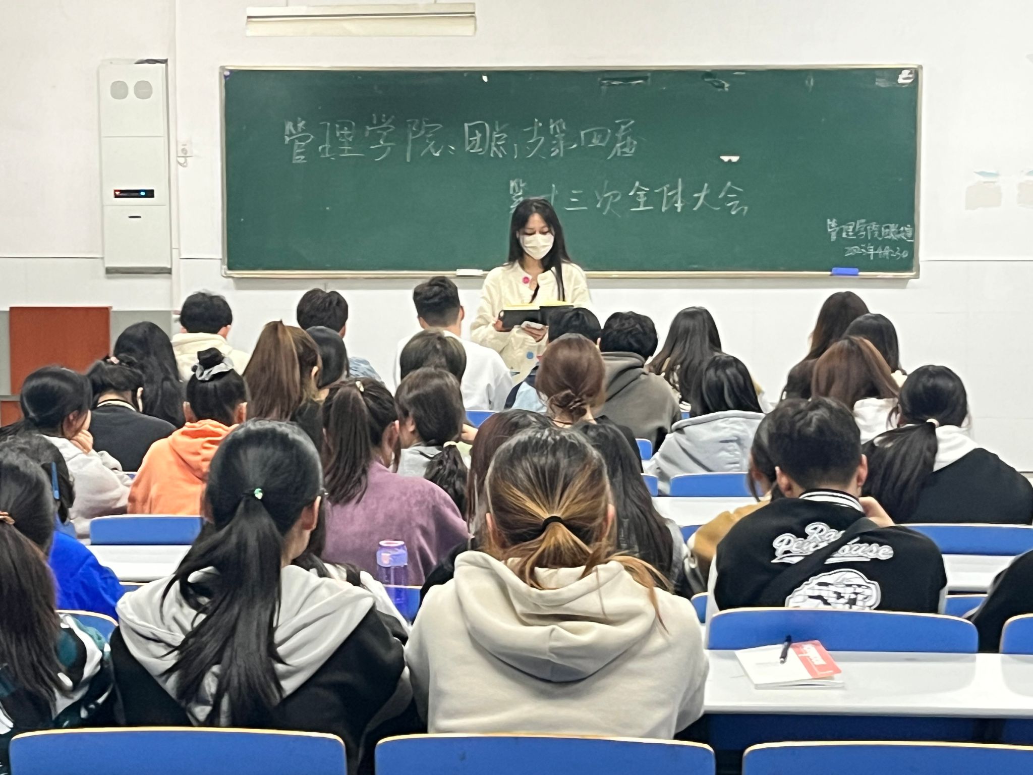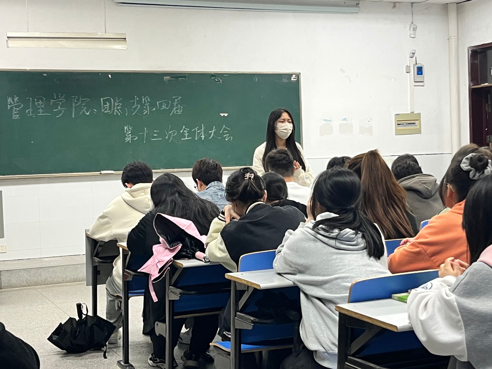 为加强管理学院团总支的整体素质和积极工作的态度,管理学院团总支于2023年4月23日18:00在1102教室开展第四届第十三次全体大会,本次大会由团总支副书记於美娜负责,团总支全体成员参加。