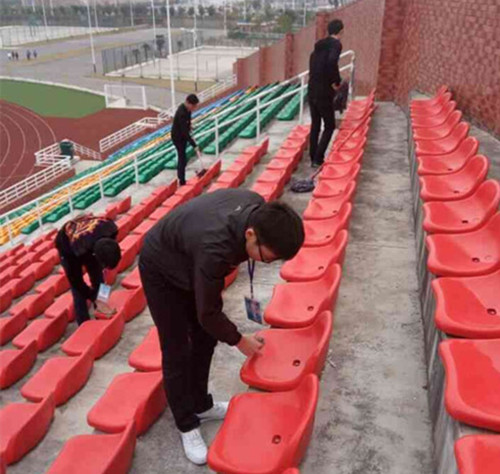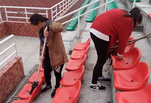 打扫过程中,志愿者们怀着饱满的热情,带着一系列的清理工具,将看台的各个角落擦拭的一干二净。