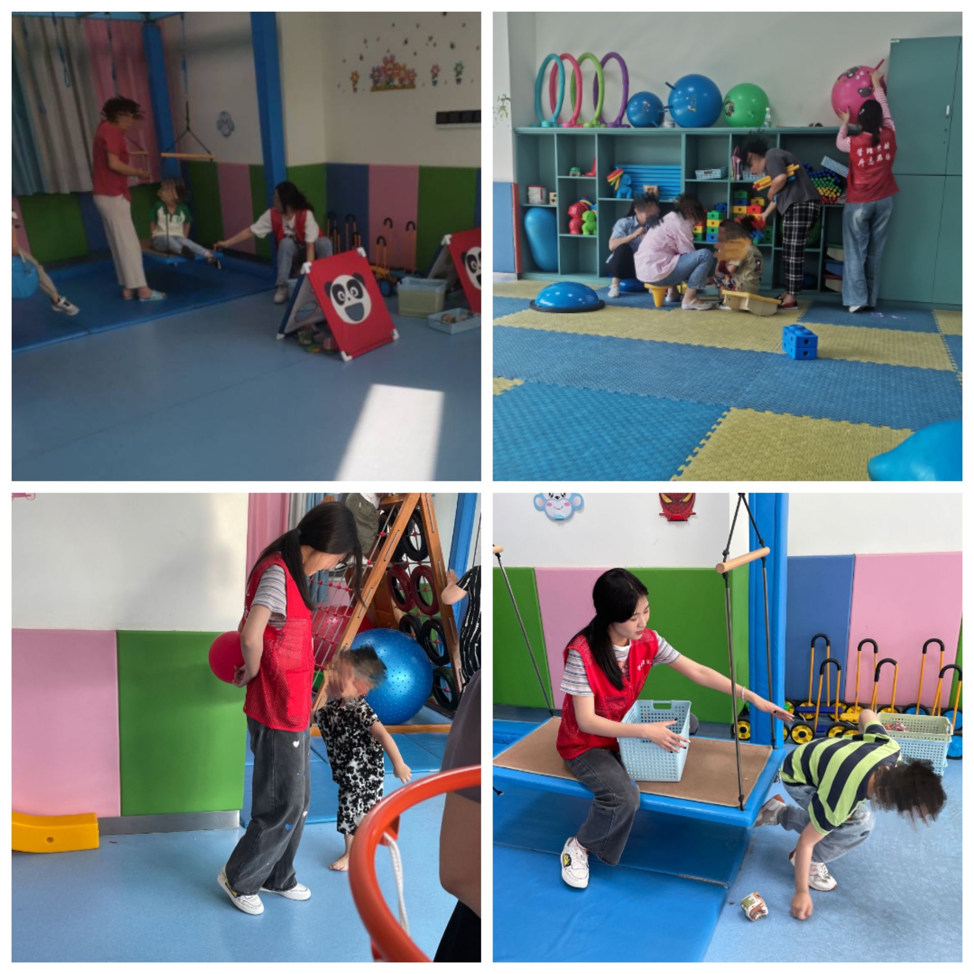 活动现场,志愿者们在负责人的引导下与孤独症儿童一起做游戏,成为他们的朋友,积极与他们沟通,提高他们的社交能力,并在老师上课时给他们辅助,陪伴他们完成每天的训练任务。