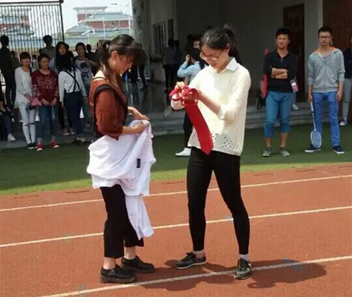 比赛一开始,同学们便快速地穿起衣服来,有的同学不慌不忙、熟练地扣上了纽扣,有的同学则紧张地不知所措。旁边的观众们抑制不住内心地激动和紧张,不停地为本班同学呐喊、助威,比赛场面紧张而激烈。最终程锡龙、程小衫、苏方卉、杨艳获得了一等奖,在此,祝贺他们。