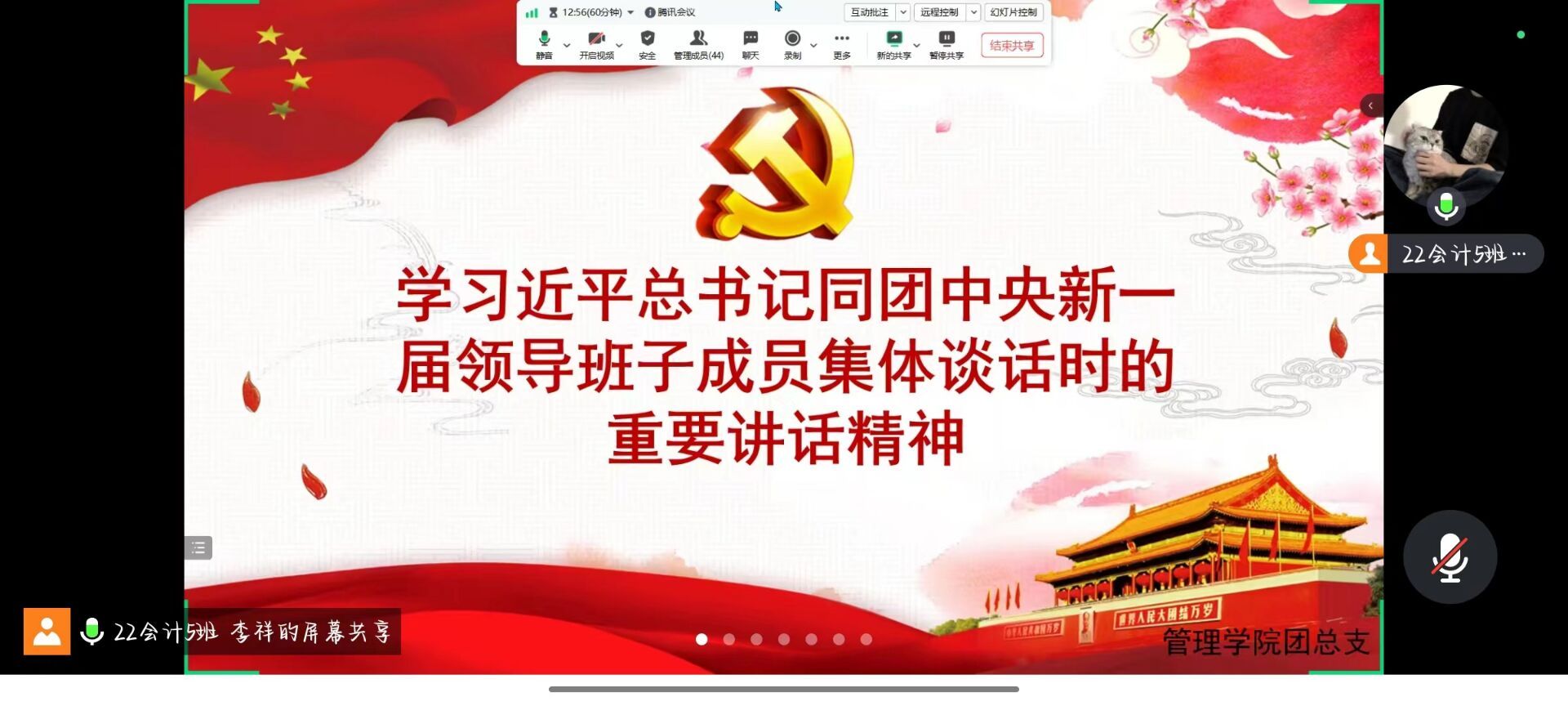 管理学院团总支于2023年7月28日在腾讯会议开展学习习近平总书记同中央新一届领导班子成员集体谈话时的重要讲话精神线上学习活动。会议由团总支文娱部李祥负责,管理学院学生积极参加。