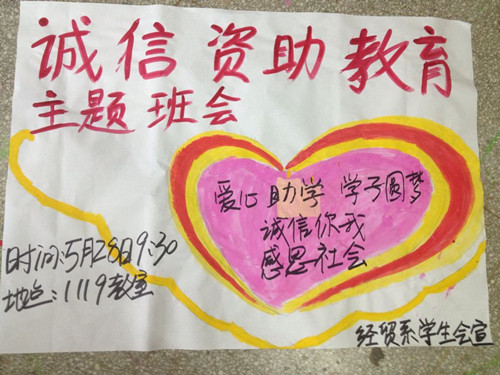 诚信是中华民族的传统美德,也是社会主义核心价值观的重要内容,更是大学生立身为人、成长成才的必备品质。为了增强经贸学子的诚信意识,加强同学们的道德修养。2014年5月27日中午,经济贸易系2012级市场营销班在经贸系教学楼1119教室成功的开展了以“资助诚信教育”为主题的班会。