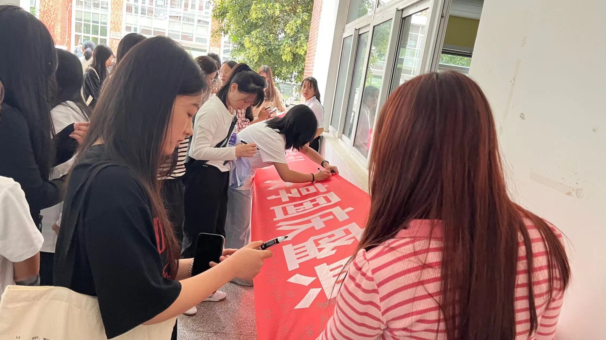 现场气氛十分热烈,同学们纷纷在横幅上写下对祖国的祝福,“祝祖国越来越繁荣昌盛”、“祝愿祖国明天更美好”,简单质朴的话语,让活动的氛围达到高潮,表达对祖国的热爱之情。满载着同学们对祖国祝福的横幅成为校园内一道亮丽的风景线。