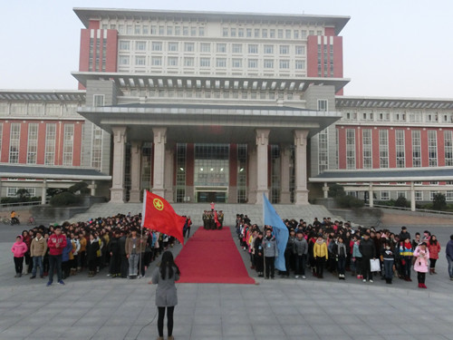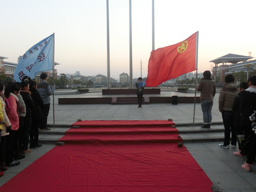 为强化考纪、端正考风,以诚信考试迎接即将到来的2014年元旦,2013年12月31日清晨,经贸系团总支、学生会组织同学们参加了“喜庆元旦,诚信迎考”主题升旗仪式,经贸系全体同学参加了此次升旗仪式。