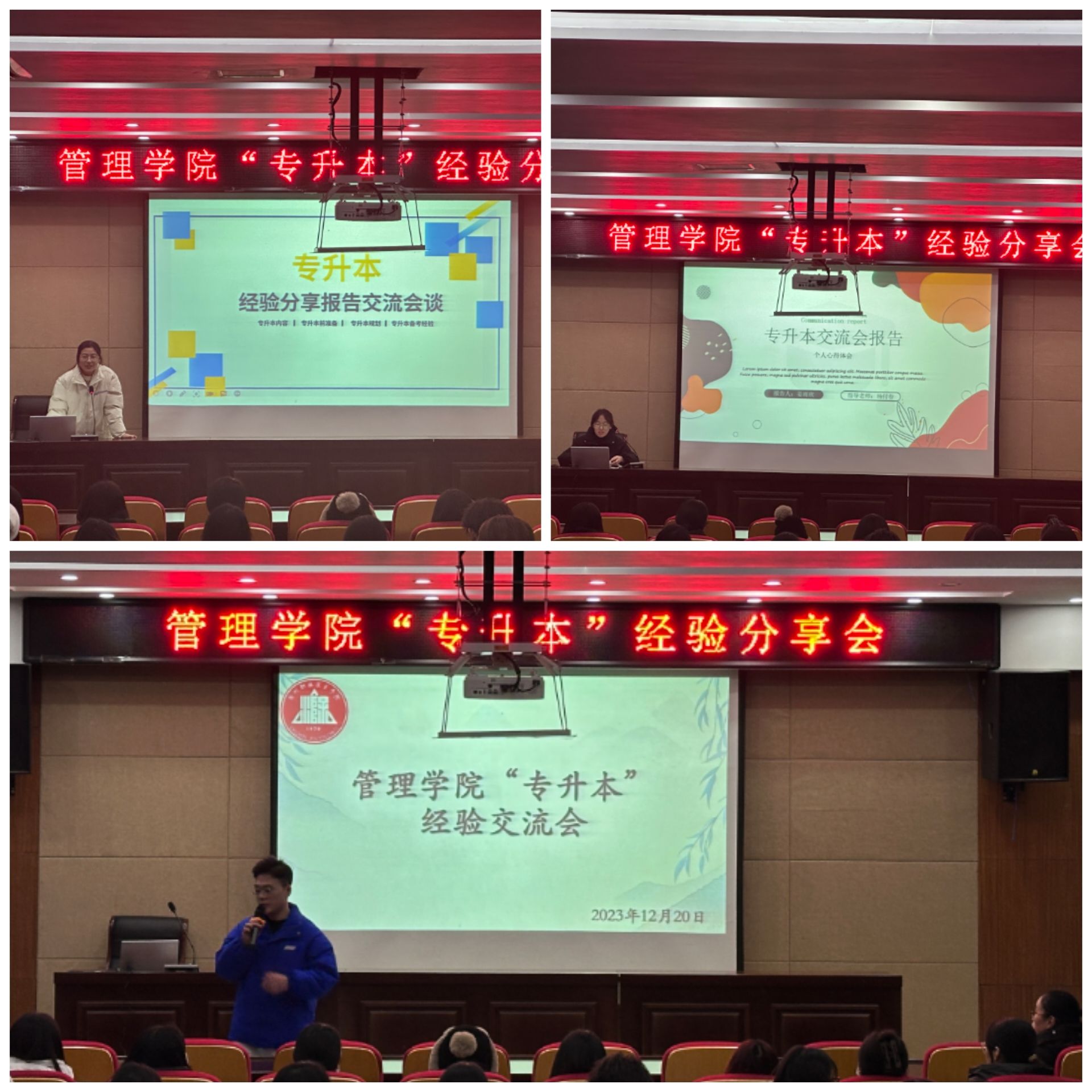 为持续推进学院学风建设,更好地为学院拟升本的学生提供帮助,2023年12月20日下午5:00管理学院邀请本科教育的3位学生在南阶205开展“专升本”经验交流会,管理学院2022级、2023级学生参加本次交流会。