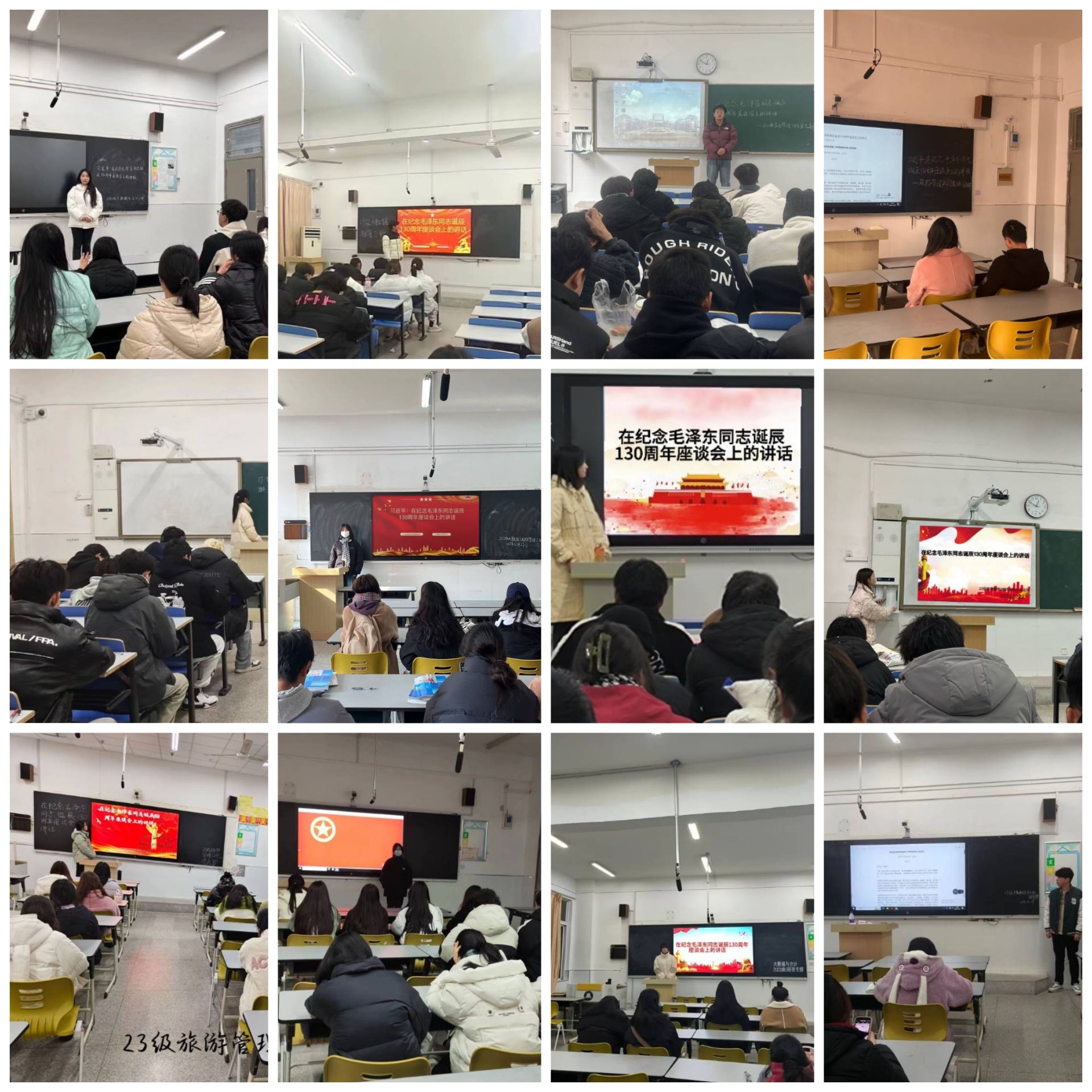 活动中,首先,各班团支书以ppt的形式向同学们讲述了毛泽东同志为建党、建军、建国和社会主义革命建设事业建立的丰功伟绩,强调毛泽东同志的丰功伟绩永远不能忘,毛泽东思想永远不能丢。同时引领班级同学学习学习贯彻习近平总书记在纪念毛泽东同志诞辰130周年座谈会上的重要讲话精神,在新时代新征程上,我们纪念毛泽东同志,要牢记革命理想高于天,始终坚定共产主义和中国特色社会主义的信仰信念!