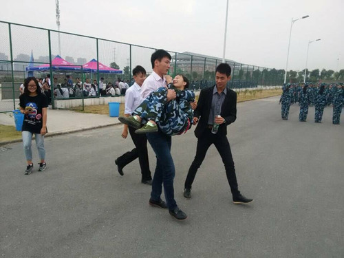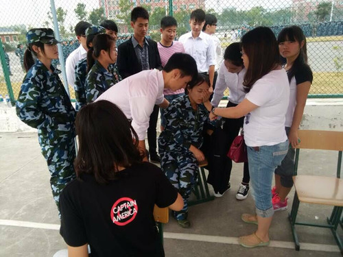 2015年9月19日上午,在经贸系军训场地发生一起因暴晒而中途晕倒事件。此时在军训服务点的志愿者看到这一幕,飞快的跑到案发点,急忙抬起晕倒的女生进行基本救护。