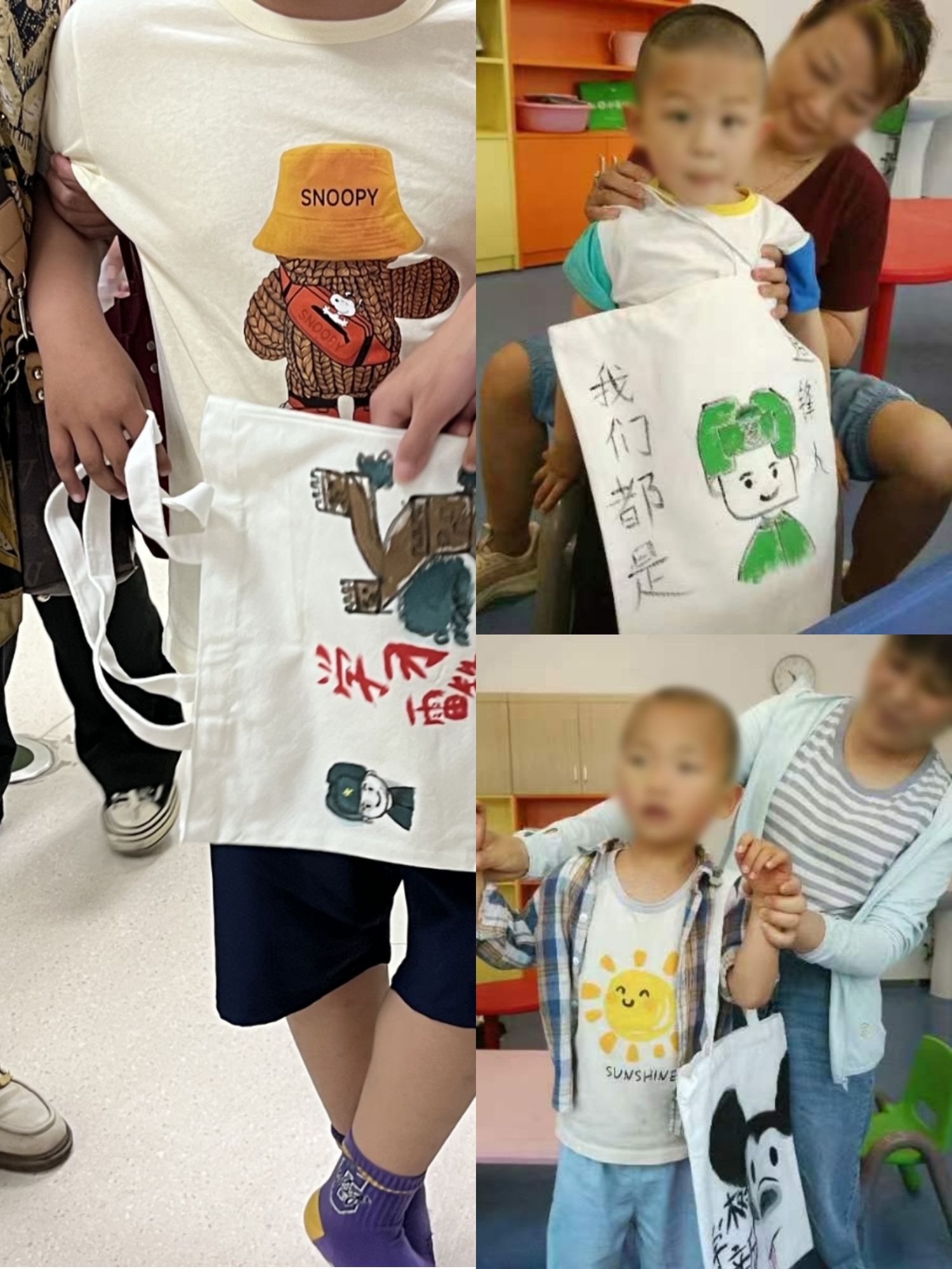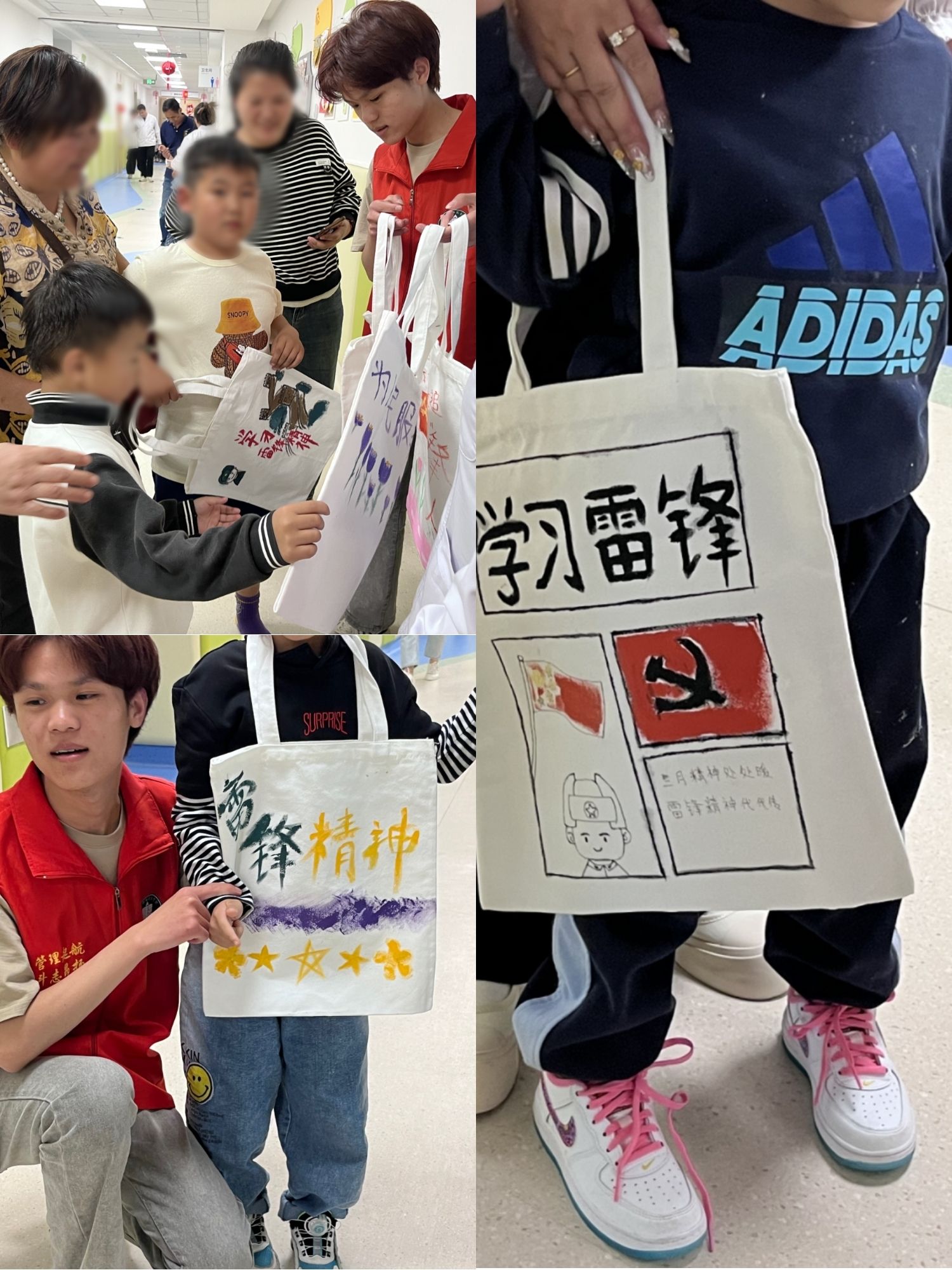 此次活动一经宣传,得到了同学们的积极响应。学生会特意在雷锋月举办了一场以“雷锋”为主题的手绘帆布包活动,同学们精心绘制了各式各样的帆布包,每一只都充满了他们的关爱和祝福。在帆布包上,大家用彩笔描绘出雷锋的形象,象征着无私奉献和爱心。此外,他们还绘制了各种图案和文字,旨在传达温暖和关怀。二院的小朋友们拿到帆布包后,纷纷围在桌前,欣赏这些色彩斑斓、充满创意的帆布包。孩子们的脸上洋溢着喜悦和幸福,他们喜欢这些温暖的礼物,也喜欢和志愿者一起玩耍。
