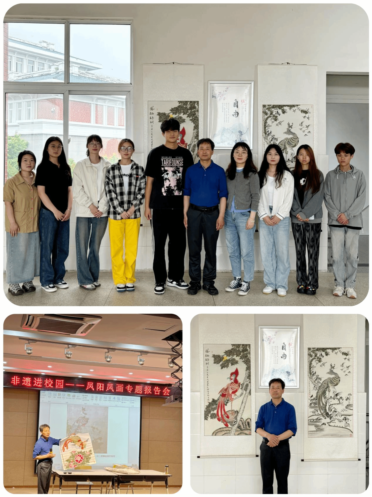 凤阳凤画报告会则展现了地方特色文化的绚丽多彩,特邀专家以生动的语言和丰富的图文资料,详细阐述了凤阳凤画的历史渊源、艺术风格、绘画技巧以及其在传统文化中的重要地位。在讲解过程中,大屏幕上展示出的一幅幅精美的凤画作品,让师生们不时发出阵阵惊叹。专家还分享了一些凤画创作背后的故事和趣闻,使大家对这一传统艺术有了更深入的认识。