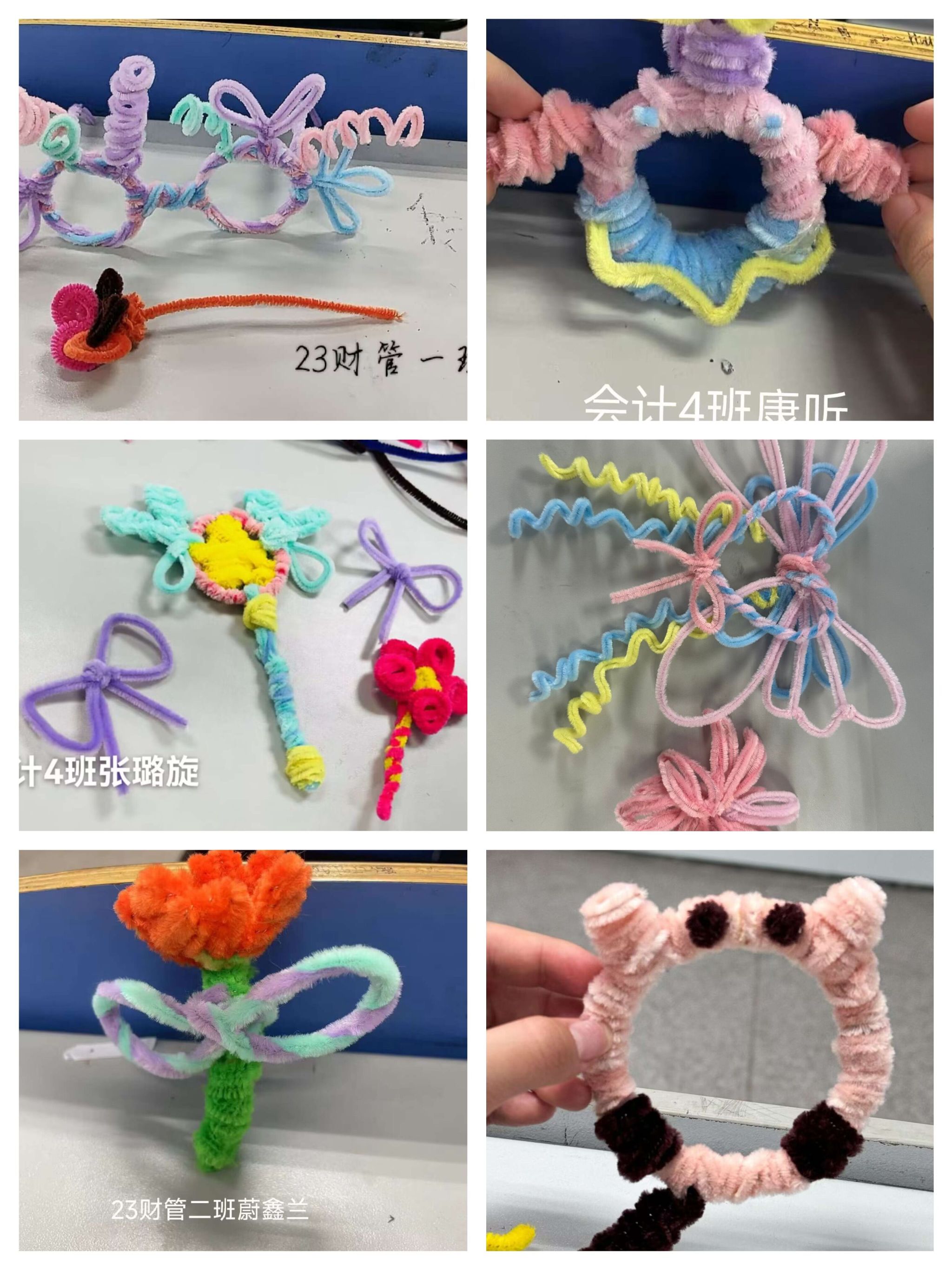 活动现场,五颜六色的扭扭棒成为了大家争相尝试的创作材料。同学们纷纷拿起扭扭棒,开始动手创作。他们或低头专注地编织花朵,或巧手翻飞地制作手环,或精心打造精致的蛋糕模型。每一件作品都凝聚了同学们的汗水和智慧,展现出了他们的创意和才华。活动过程中,同学们互帮互助,相互学习,不仅锻炼了自己的动手能力,还增进了彼此之间的友谊。现场气氛热烈而和谐,欢声笑语此起彼伏,充分展现了管理学院学子的积极向上的精神风貌。最终经评比,由23级旅游管理三班司婷婷、23大数据与会计四班马雨晗、23大数据与财务管理一班钱伟龙荣获一等奖。