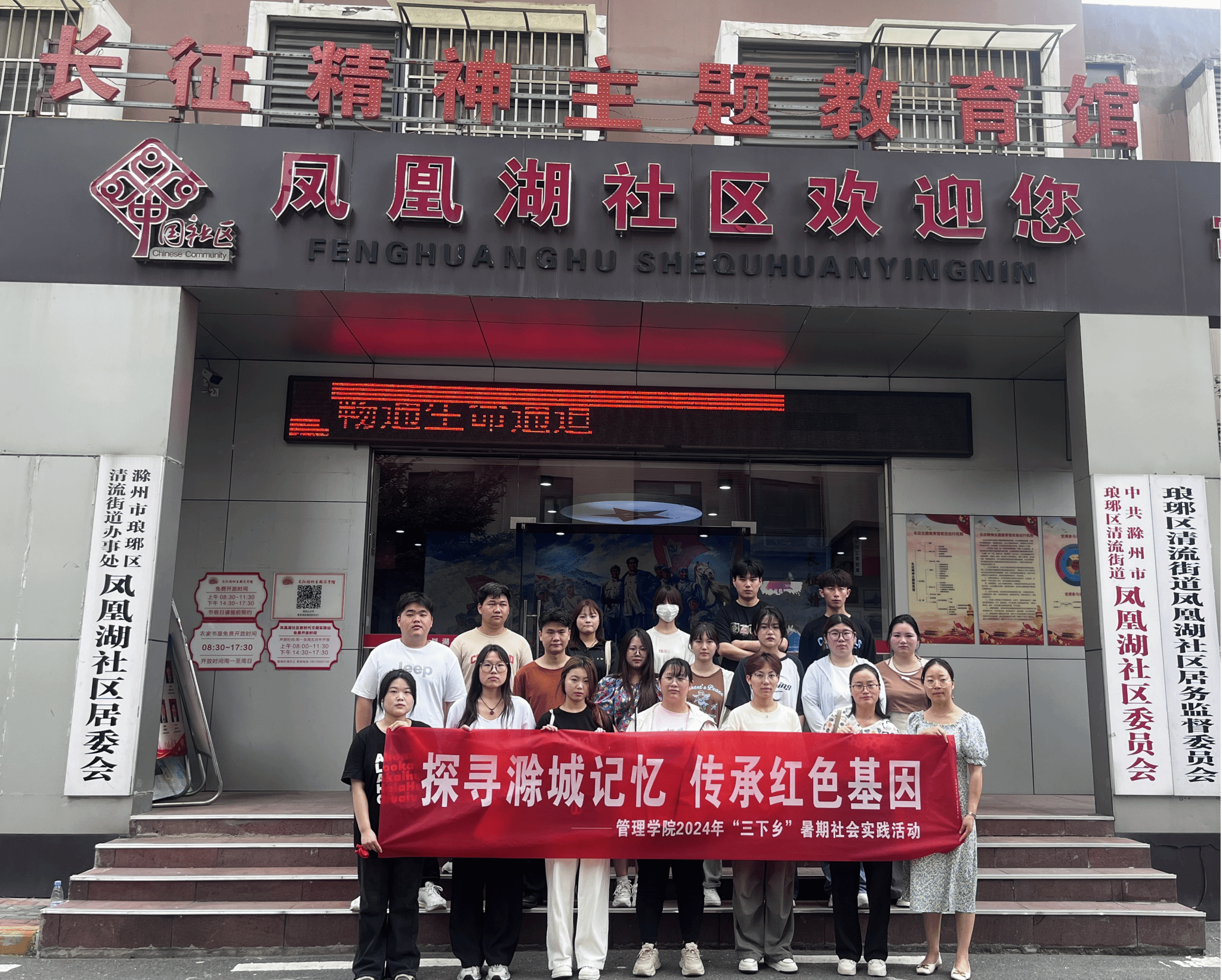 为深入贯彻落实习近平新时代中国特色社会主义思想和党的二十大精神,引导青年学生在实践中认识社会服务社会、增长知识增长才干,6月26日,管理学院组织学生前往滁州市凤凰湖社区长征精神主题教育馆开展暑期社会实践活动,本次活动由吴珍珍、孙宛秋、汪亚运负责,管理学院二十余名学生参加。