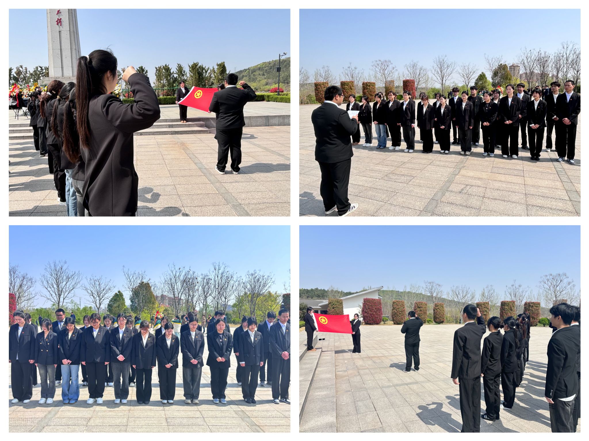当天上午,同学们身着正装,怀着崇敬的心情来到镜园。在庄严肃穆的革命烈士纪念碑前,四名学生代表迈着坚定的步伐,向革命烈士敬献花篮。鲜花簇拥的花篮寄托着大家对革命先烈的无限敬仰和深切缅怀之情。全体成员整齐列队,向革命烈士鞠躬默哀,以庄重的方式表达对先烈们的沉痛悼念。