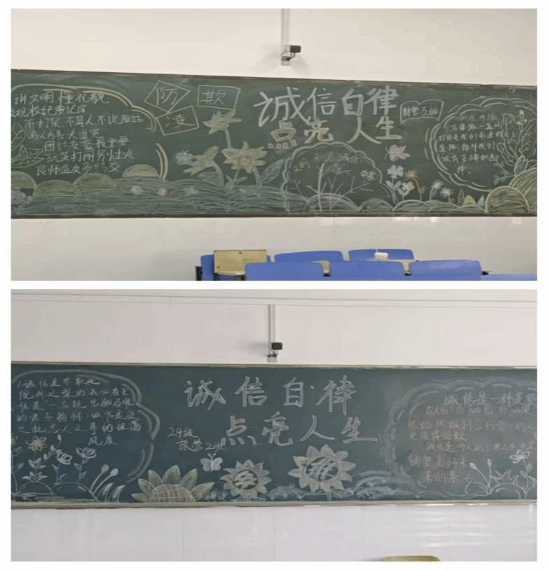 5月25日,管理学院组织以“诚·风拂校园,信·笔绘初心”为主题的黑板报活动,鼓励班级通过画笔诠释诚信内涵,将传统美德与创意设计结合,在团队协作中深化“以诚立身、以信立学”的价值观。