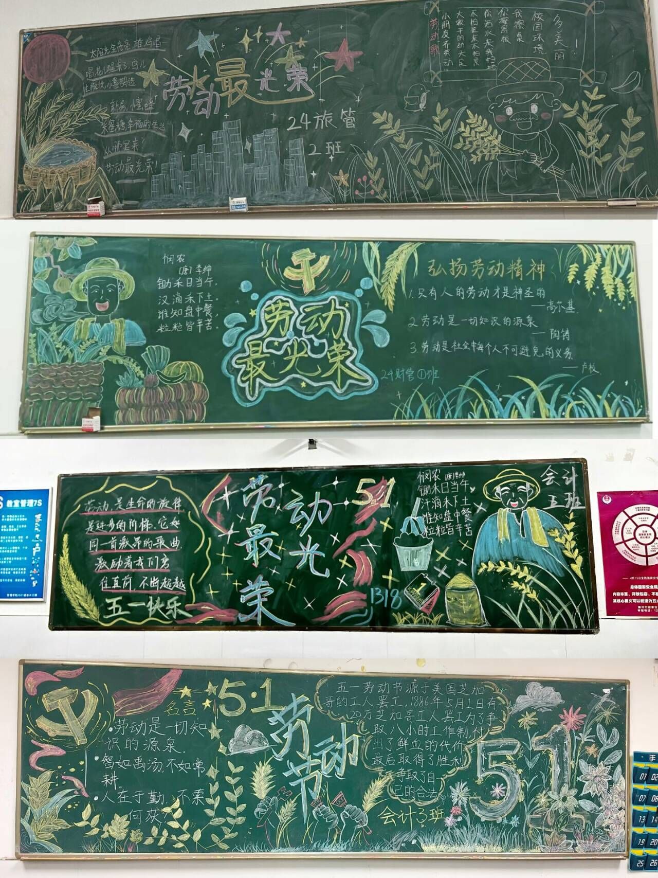 各班同学精心设计黑板报内容,通过图文并茂的形式展现劳动精神的深刻内涵。有的班级详细介绍了五一劳动节的起源,让同学们深刻了解到劳动权益的来之不易;有的班级摘录了“劳动是一切知识的源泉”等名人名言,激励大家崇尚劳动、尊重劳动;还有的班级绘制了农民、工人等劳动者形象,展现劳动的多样与伟大。