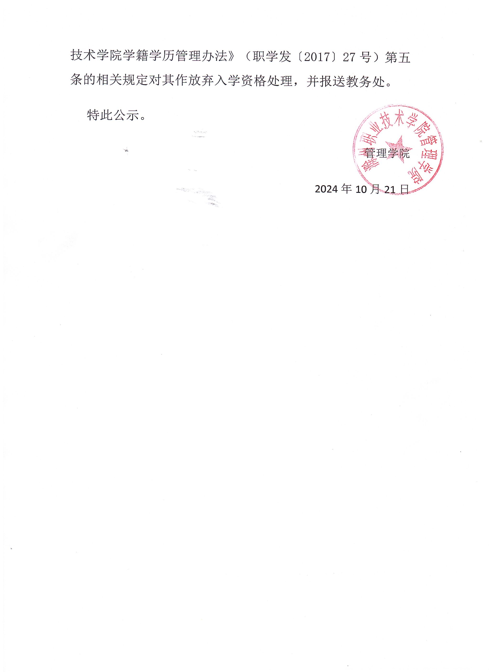 管理学院关于对龚科等三名保留入学资格逾期学生作放弃入学资格处理的公示