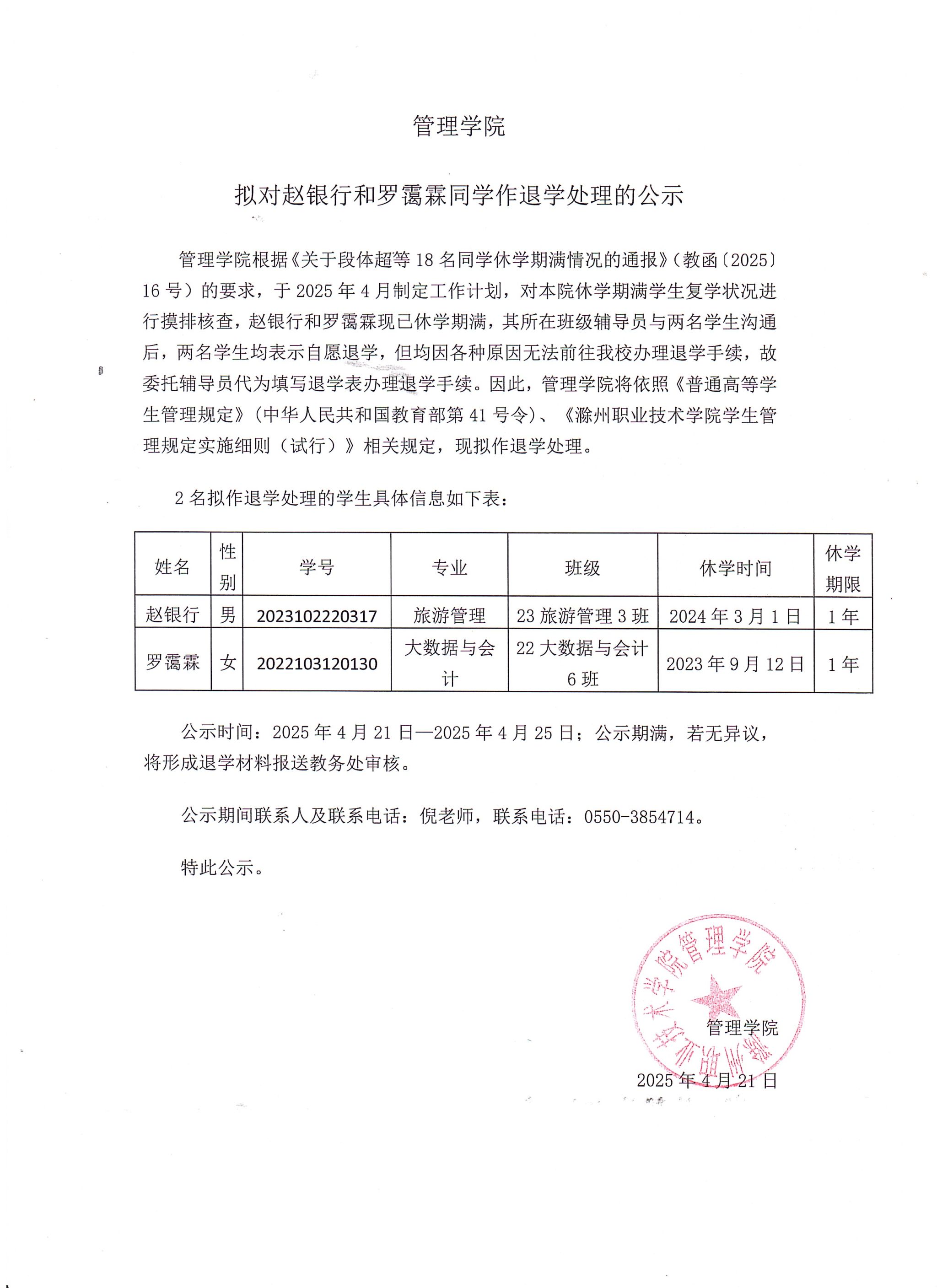 管理学院拟对赵银行和罗霭玲同学作退学处理的公示