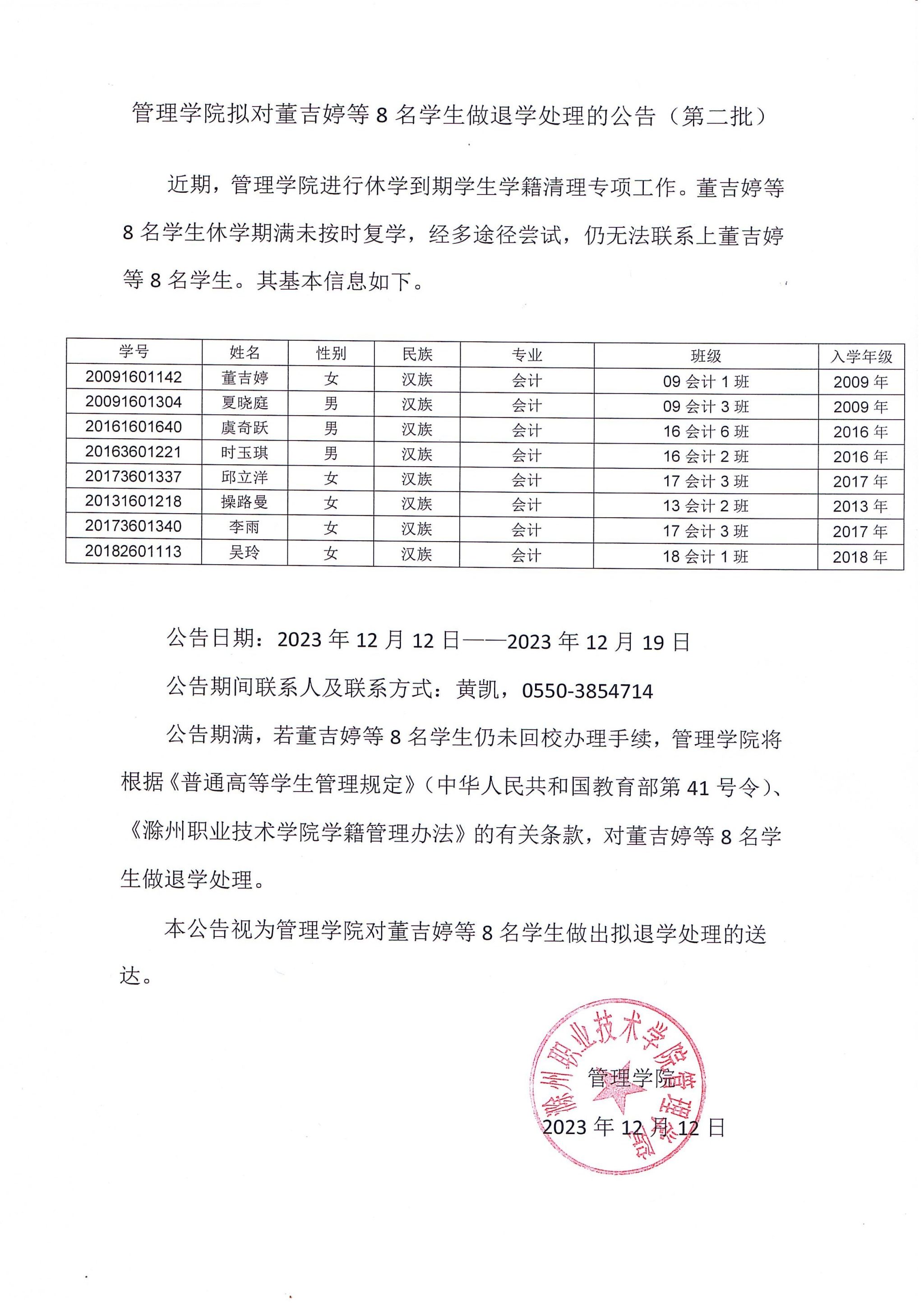 管理学院拟对董吉婷等8名学生做退学处理的公告(第二批)