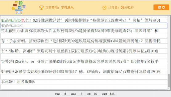 赛题为系统随机产生1600个字符 ,系统提供对照原文进行字符输入的环境系统自动根据选手在 10 分钟内完成的数量和正确率评分。