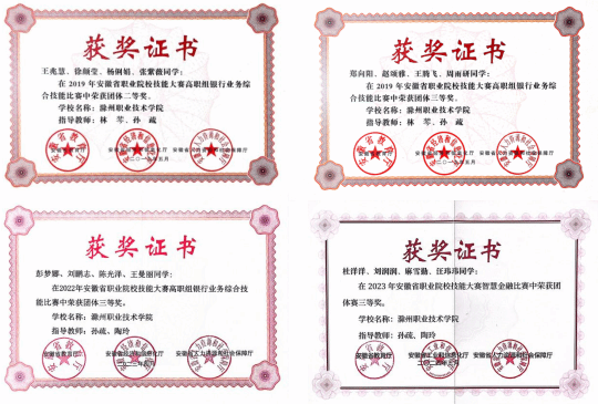 本专业学生于2019年参加安徽省职业院校技能大赛银行业务综合技能赛项获二、三等奖;2022、2023年参加安徽省职业院校技能大赛智慧金融赛项获三等奖。