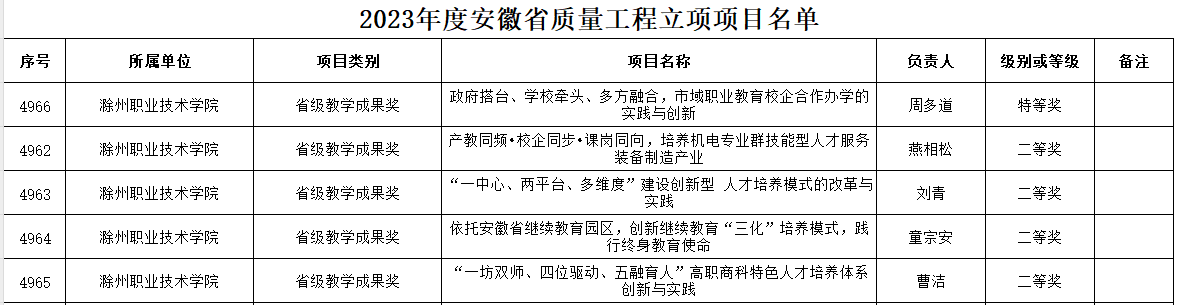 近日,安徽省教育厅公布2023年度高等学校省级质量工程项目名单,Beat365喜获五项省级教学成果奖,其中,周多道主持的“政府搭台、学校牵头、多方融合,市域职业教育校企合作办学的实践与创新”成果荣获特等奖,这是Beat365首次获得该项荣誉,也是Beat365在教学改革与人才培养工作取得的重大突破。