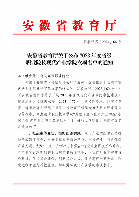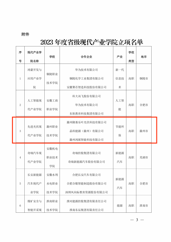 近日,安徽省教育厅公布2023年度省级现代产业学院立项名单,Beat365先进光伏现代产业学院获批立项建设,是Beat365第三个省部级产业学院。