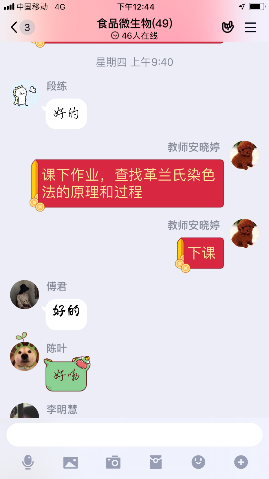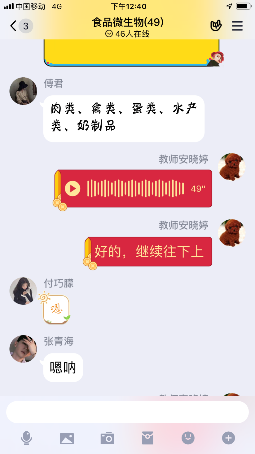 我会让同学们打开我在群里发的ppt,用语音讲解本节课学习的主要内容,接着带着大家看中国大学慕课上已选好的精品课程,看完一个知识点大概10分钟,我会在群里提问,很多同学都积极回答,我还会提一些引申的问题,让同学们自己查找资料(比如讲微生物发展历史,我会让同学们查找青霉素的发现过程),我会在群里给大家回复,进行大概10分钟的交流讨论,接着我还会让大家打开ppt,我用语音或者腾讯会议直播继续讲解这个知识点,加深同学们的理解,达到巩固的效果。