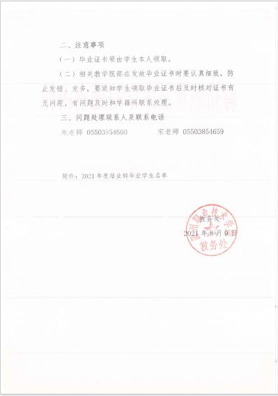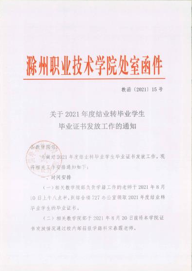 关于2021年度结业转毕业学生毕业证书发放工作的通知 教函〔2021〕15号