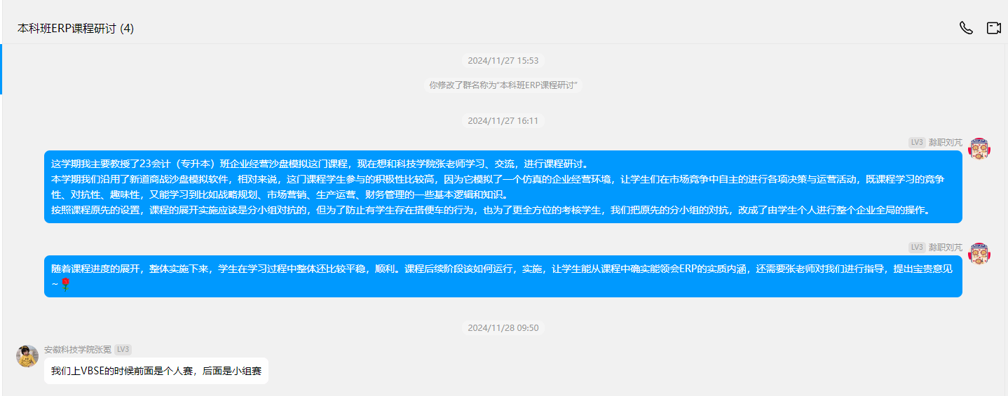 11月27日下午,专升本会计学专业《企业经营沙盘模拟》授课教师刘芃与安徽科技学院财经学院张冕老师在云端开展了主题为“优化教学形式,提高教学质量”的线上课程研讨活动。