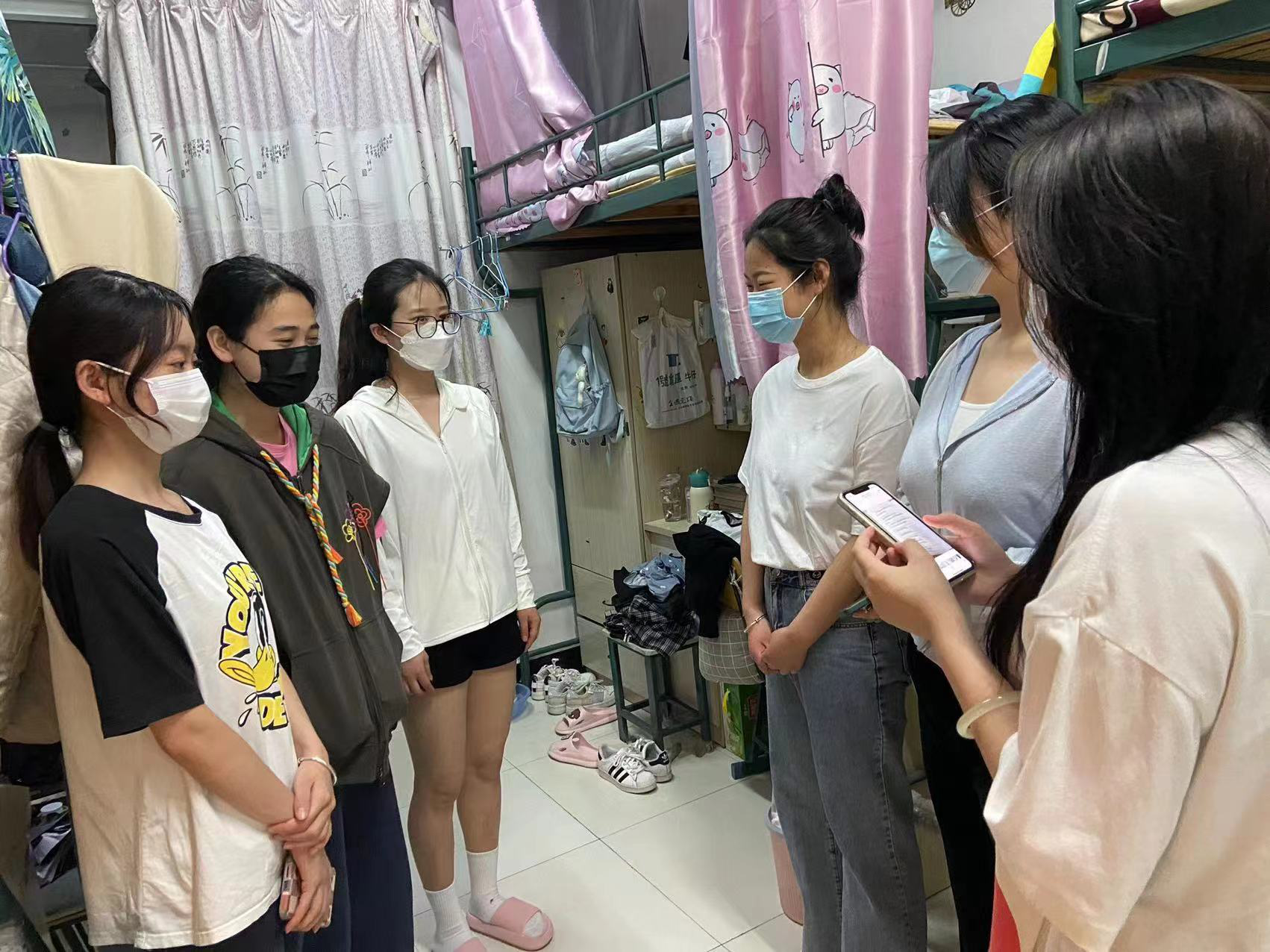 在走访过程中,党员同学向同学们宣讲下午会议上提到的“五个不许”:不许不经报备私自出校门;不许到人群聚集的场所;不许晚归和夜不归宿;不许聚众酗酒;不许隐瞒行程轨迹。党员小队还向同学宣讲了聚众酗酒的危害、使用大功率电器的安全隐患,向同学们宣传普及了学校对使用电器的规定,并通过部分高校宿舍失火的真实案例提醒同学们进一步加强疫情防控和安全防护意识,严防火灾和人身意外伤害事故的发生。宣讲结束后,各个小队通过发动各班班长在班群里再次进行宣传。