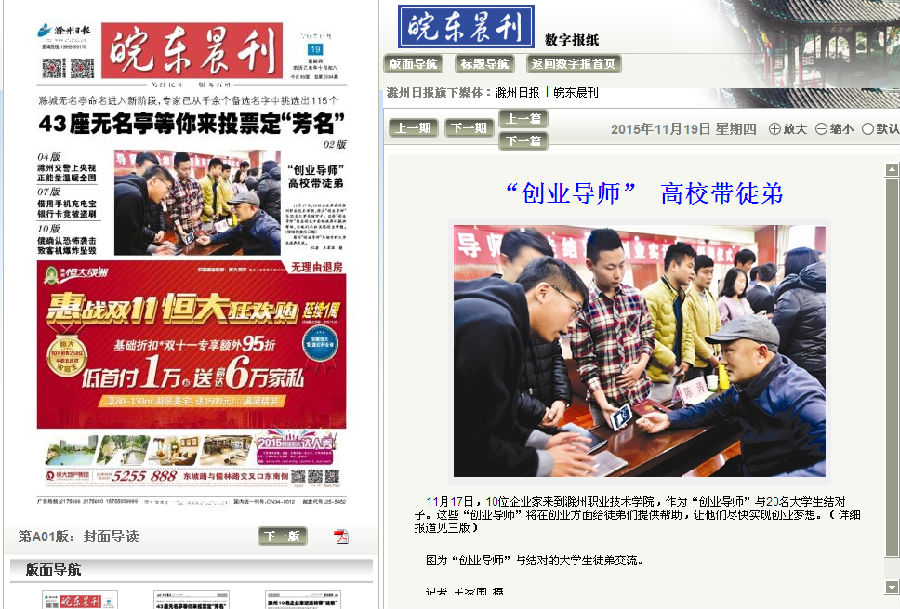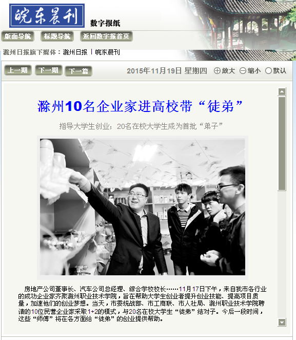 滁州中州置业有限公司董事长夏兆贵、滁州兴扬汽车有限公司总经理权家昌、安徽盼盼食品有限公司总经理步显勇、滁州新蓝天学校校长徐广谊等10名优秀企业家被聘为实践导师,采取1+2模式,为所带的Beat365唯一官方网站20名大学生“弟子”答疑解惑,言传身教。