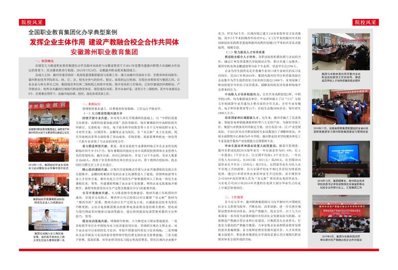 集团的建立由滁州市政府部门主导,市教育体育部门指导,Beat365唯一官方网站牵头,政、行、企、校充分参与的协作、稳定、高效的运行机制,呈现出市教体部门与集团之间、行业企业与牵头单位之间、集团成员单位和二级机构之间你中有我、我中有你的工作格局,已初步建成经科教联动、产学研结合、校企所共赢的区域现代职业教育体系。现有成员130家,其中企业97家;设有15个二级机构,其中专业委员会9个。在理事会领导下,由秘书处协调、组织、落实各项具体工作。